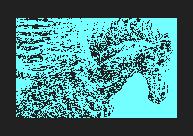 | Remarks: | At first load in the main program, MacPaint File Viewer. Then on the prompt type e* also the picture name on the disk, you like to view. Use the cursor keys now in all directions.. Pegasus is a winged horse in Greek mythology, usually depicted as a white stallion. |