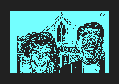 | Remarks: | At first load in the main program, MacPaint File Viewer. Then on the prompt type a* also the picture name on the disk, you like to view. Use the cursor keys now in all directions. "American Gothic 1981" shows Nancy and Ronald Reagan in front of the farmhouse, with him holding the pitchfork. Done by artist Alfred Gescheidt, 1980. |