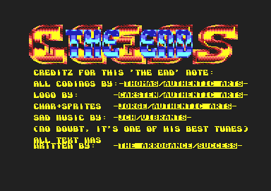 | Credits: | Code Thomas of Authentic Arts Music Scarzix Graphics Carsten of Authentic Arts Charset Executor of Success and Authentic Arts Unspecified The Arrogance of Success |