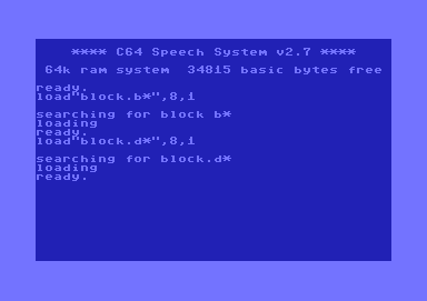 | Remarks: | At first load"speech basic",8,1 and start the program with run. Now load "block.b*",8,1. After these load "block.d*",8,1. Type run. Any problems ? Kill your Cartridge. |
