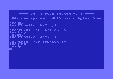 | Remarks: | At first load"speech basic",8,1 and start the program with run. Now load "bostich.b*",8,1. After these load "bostich.d*",8,1. Type run. Any problems ? Kill your Cartridge. "Bostich" is a song by Swiss synthpop band Yello, 1981. |