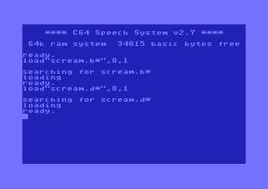 | Remarks: | At first load"speech basic",8,1 and start the program with run. Now load "scream.b*",8,1. After these load "scream.d*",8,1. Type run. Any problems ? Kill your Cartridge. |